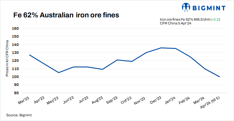 Iron ore (Fe 62%) fines spot prices remained stable d-o-d at $98.5/t CFR China on 5 Apr’24 following the muted trading activity amid the ongoing Qingming festival. As per the report, the market movements remained subdued in recent days and participants expect no clear indication of significant shifts in iron ore prices in the near term.