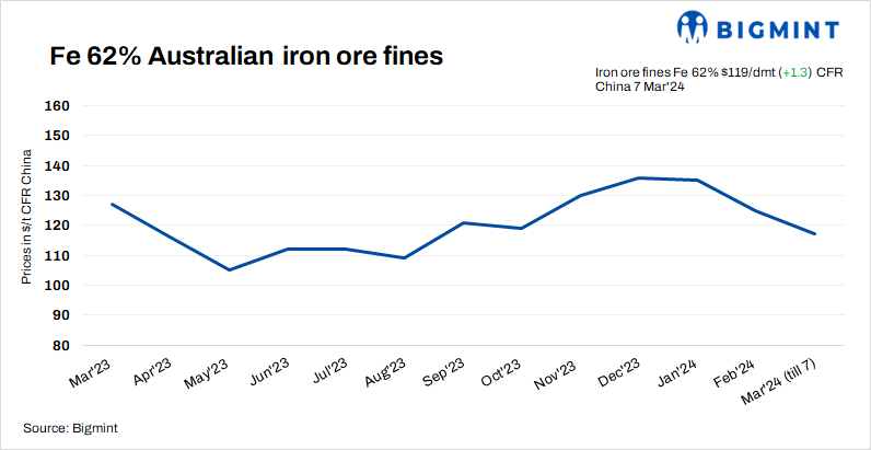 Iron ore (Fe 62%) fines spot prices increased by $1.3/t d-o-d to $119/t CFR China on 7 Mar’24 as few trading activities were recorded due to a slight uptick in the demand for finished steel goods. Steel mill production margins have slightly improved, which shifted mills’ focus to buying medium and high-grade iron ore cargoes. Meanwhile, DCE iron ore futures for the May 2024 contract also rose by RMB 8.5/t ($1/t) d-o-d to RMB 890/t ($124/t) yesterday.