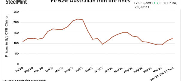 Iron ore spot prices of the benchmark Fe 62% fines in China increased by $1.7/t d-o-d to $126.65/t CFR on 20 Jan’23. The market saw low buying interest for seaborne iron ore as most buyers retreated in preparation of the upcoming holidays. Several sources continued to hold positive expectations of the market following the holidays.