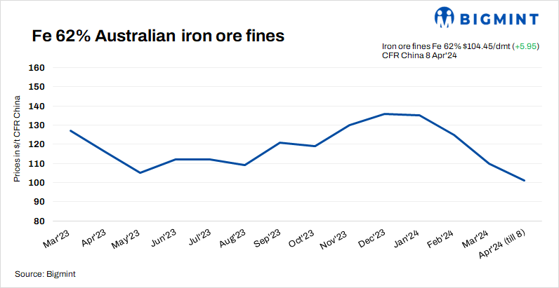 Iron ore (Fe 62%) fines spot prices rebounded by $5.95/t to $104.45/t CFR China on 8 Apr’24 amid improved buying interest following the recovered steel margin. However, mills are still reluctant to use high grade, opting instead for lower grade fines. Market participants expect that demand might increase in the second quarter of CY24 with mills restocking more often on improving margins.
