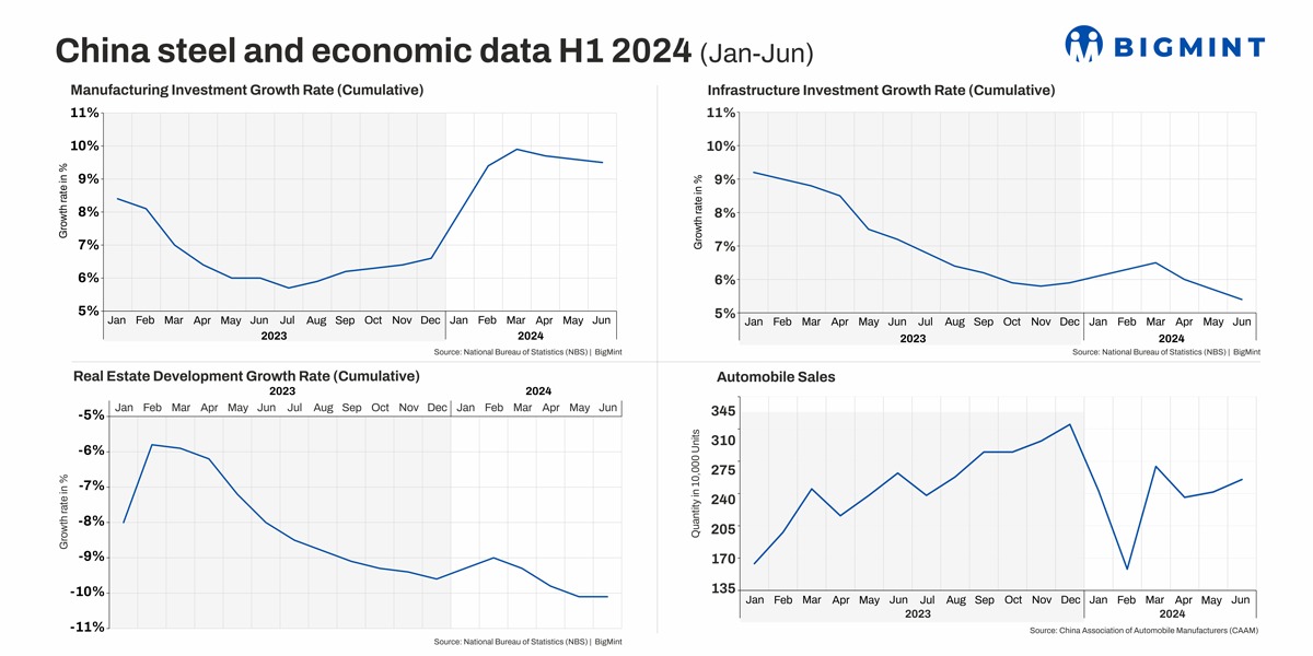 China’s macro indicators continued to show a bearish trend with five of the nine parameters in decline over January-June, 2024, as per data tracked by BigMint. Crude steel output continued to fall. Manufacturing investment growth remained stable m-o-m till June but infrastructure investment growth showed a y-o-y fall. Realty development degrowth continued to deepen despite the booster shots.