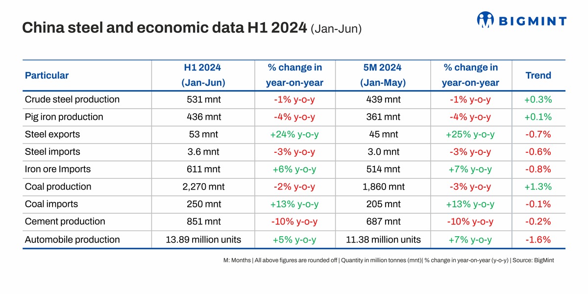 The first half of 2024 in China’s steel and economic sectors reveals that the Crude steel production amounted to 531 million tonnes, reflecting a 1% decrease compared to the previous year, while pig iron production declined by 4% to 436 million tonnes. Steel exports notably surged by 24% to reach 53 million tonnes, contrasting with a minor 3% decrease in steel imports, which totaled 3.6 million tonnes. Iron ore imports, however, increased by 6% to 611 million tonnes. The coal production sector saw a 2% decline to 2,270 million tonnes, while coal imports rose by 13% to reach 250 million tonnes. Cement production notably fell by 10% to 851 million tonnes, and automobile production experienced a 5% increase, reaching 13.89 million units.