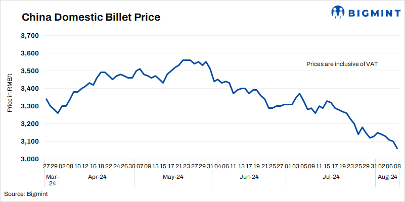- Billet prices in Tangshan decreased by RMB 40/t ($6/t) to RMB 3,060/t ($427/t) d-o-d on 8 Aug’24. Prices include 13% VAT.