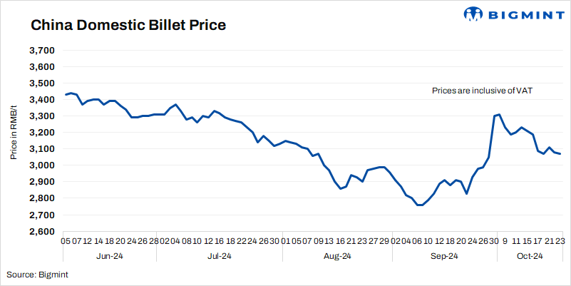 - Steel billet prices in China’s Tangshan dipped by RMB 10/t ($1/t) d-o-d to RMB 3,070/t ($431/t) on 23 Oct’24. Prices include 13% VAT.
