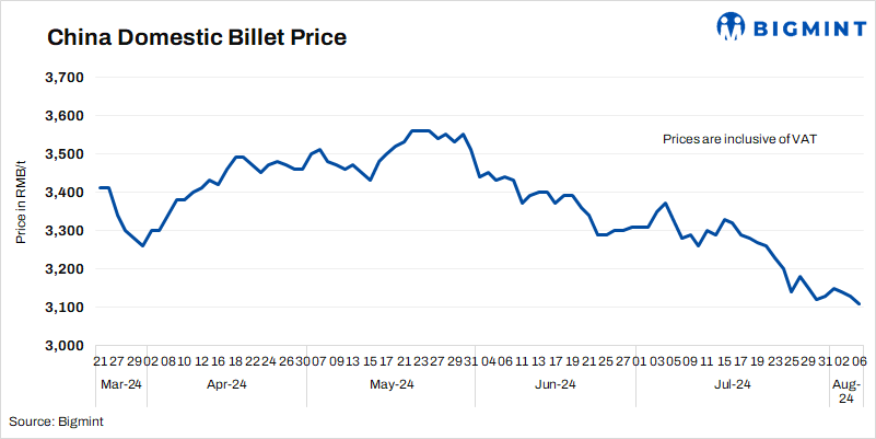 - Billet prices in Tangshan dipped by RMB 20/t ($3/t) d-o-d to RMB 3,110/t ($435/t) on 6 Aug’24. Prices include 13% VAT.