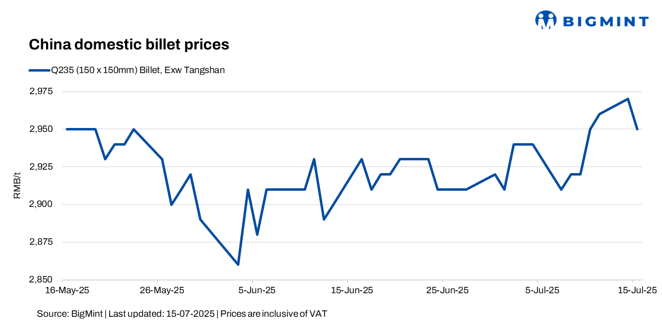 - Steel billet prices in Tangshan, China, fell by RMB 20/t ($3/t) d-o-d to RMB 2,950/t ($411/t), including 13% VAT, on 15 Jul’25.