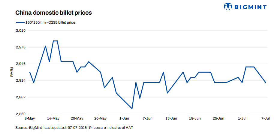 • Steel billet prices in Tangshan, China, fell by RMB 30/t ($4/t) to RMB 2,910/t ($406/t), including 13% VAT, on 7 Jul against 4 Jul’25.