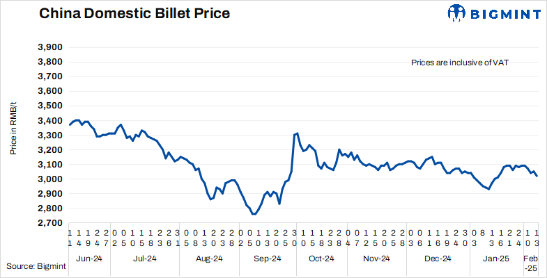 - Steel billet prices in China’s Tangshan dropped by RMB 30/t ($4/t) d-o-d to RMB 3,020/t ($413/t) on 13 Feb’25. Prices include 13% VAT.