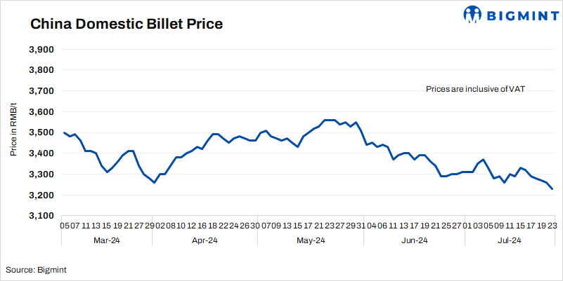 - Billet prices in Tangshan dropped by RMB 30/t ($4/t) d-o-d to RMB 3,230/t ($444/t) on 23 Jul’24 against 22 Jul’24. Prices include 13% VAT.