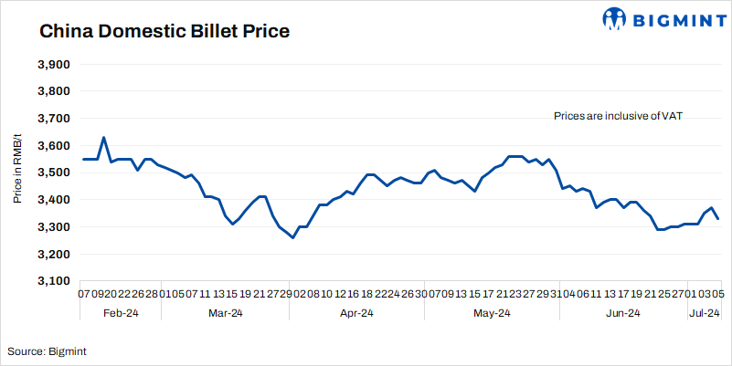 - Billet prices in Tangshan dropped by RMB 40/t ($5/t) d-o-d to RMB 3,330/t ($458/t) on 5 Jul’24. Prices include 13% VAT.