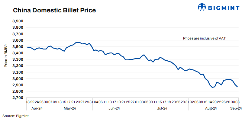 - Steel billet prices in Tangshan fell by RMB 40/t ($6/t) d-o-d to RMB 2,870/t ($403/t) on 3 Sep’24. Prices included 13% VAT.