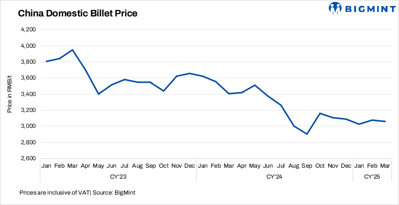• Billet prices in Tangshan, China, dropped by RMB 40/t ($6/t) d-o-d to RMB 3,040/t ($419/t) on 7 Mar’25, including 13% VAT.