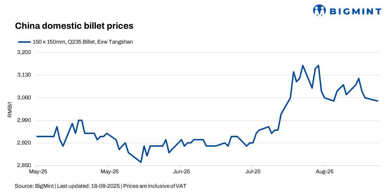 - Tangshan billet fell RMB 10/t ($1/t) to RMB 3,050/t, while SHFE Oct’25 rebar rose RMB 35/t ($5/t) to RMB 3,244/t.