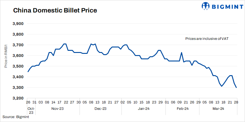- Billet prices in Tangshan continue to fall d-o-d by RMB 40/t ($6/t) to RMB 3,300/t ($457/t) on 28 Mar’24. Prices include 13% VAT.