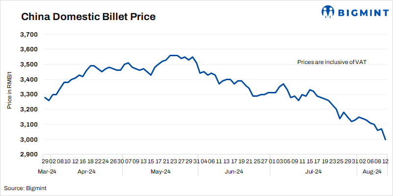 • Billet prices in Tangshan decreased significantly by RMB 70/t ($10/t) to RMB 3,000/t ($418/t) on 12 Aug’24 against 9 Aug’24. Prices include 13% VAT.
