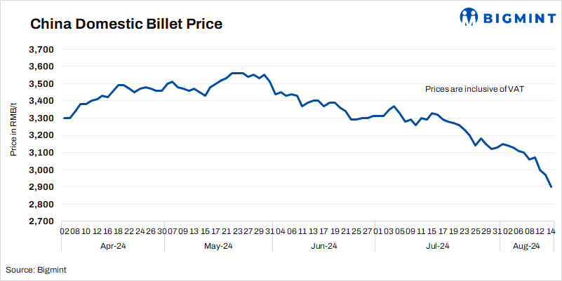 - Billet prices in Tangshan dropped sharply by RMB 70/t ($10/t) d-o-d to RMB 2,900/t ($405/t) on 14 Aug’24. Prices include 13% VAT.