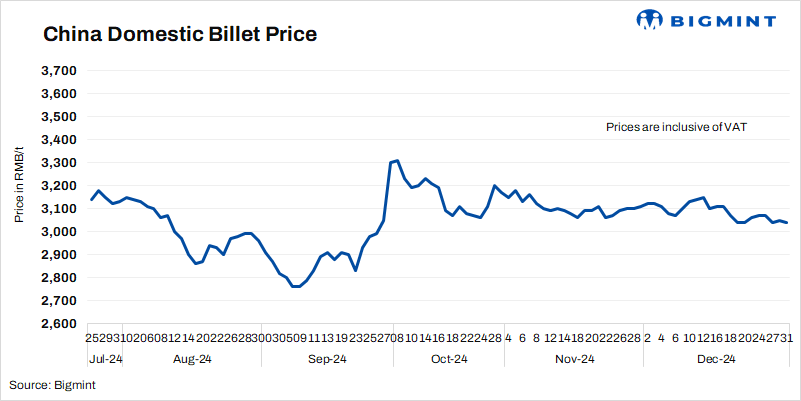 - Steel billet prices in China’s Tangshan inched down by RMB 10/t ($1/t) d-o-d to RMB 3,040/t ($416/t) on 31 Dec’24. Prices include 13% VAT.