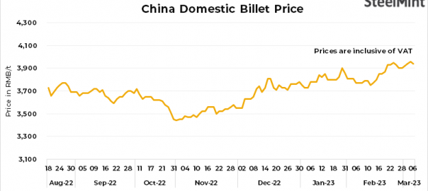 • Domestic billet prices in China’s Tangshan fell by RMB 20/t ($3/t) to RMB 3,940/t ($568/t), inclusive of 13% VAT on 6 Mar’23.