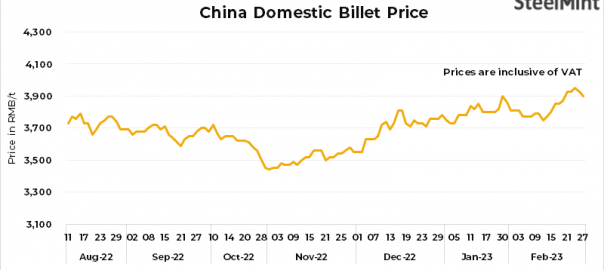 - Domestic billet prices in China’s Tangshan fell by RMB 30/t ($4/t) to RMB 3,900/t ($561/t), inclusive of 13% VAT on 27 Feb’23.
