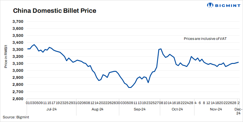 - Billet prices in China’s Tangshan rose by RMB 10/t($1/t) to RMB 3,120/t ($429/t) on 2 Dec’24 against 29 Nov. Prices include 13% VAT.