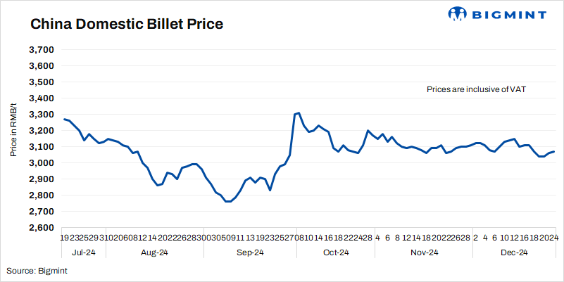 - Steel billet prices in China’s Tangshan inched up by RMB 10/t ($1/t) d-o-d to RMB 3,070/t ($421/t) on 24 Dec’24. Prices include 13% VAT.