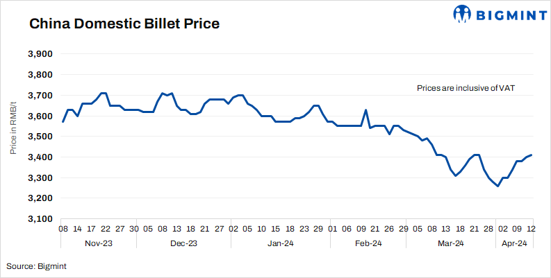- Billet prices in Tangshan inched up d-o-d by RMB 10/t ($1/t) to RMB 3,410/t ($471/t) on 12 Apr’24. Prices include 13% VAT.