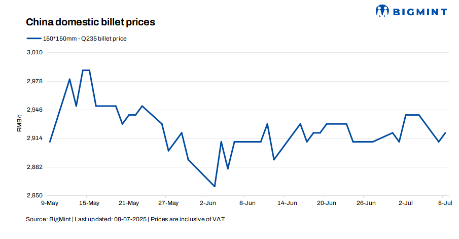 - Steel billet prices in Tangshan, China, rose by RMB 10/t ($1/t) d-o-d to RMB 2,920/t ($407/t), including 13% VAT, on 8 Jul’25.