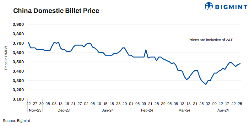 • Billet prices in Tangshan edged up d-o-d by RMB 10/t ($1/t) to RMB 3,480/t ($480/t) on 25 Apr’24. Prices include 13% VAT.