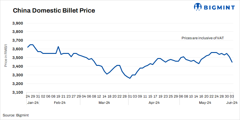 • Billet prices in Tangshan inched up by RMB 10/t ($1/t) d-o-d to RMB 3,450/t ($476/t) on 4 Jun’24. Prices include 13% VAT.