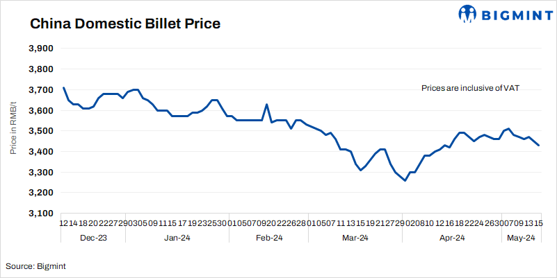 - Billet prices in Tangshan fell d-o-d by RMB 20/t ($3/t) to RMB 3,430/t ($475/t) on 15 May’24. Prices include 13% VAT.