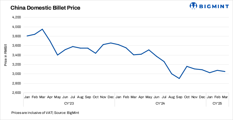 - Steel billet prices in China’s Tangshan fell by RMB 20/t ($3/t) to RMB 3,040/t ($420/t) on 17 Mar’25 against 13 Mar, including 13% VAT.