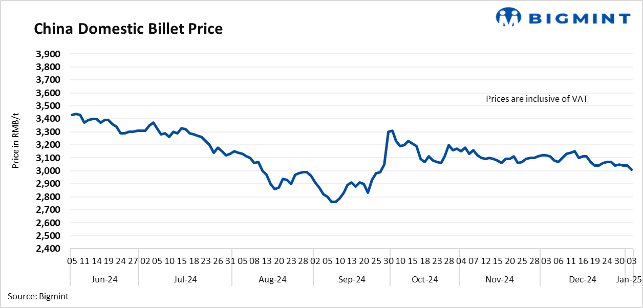 - Steel billet prices in China’s Tangshan fell by RMB 30/t ($4/t) d-o-d to RMB 3,010/t ($411/t) on 3 Jan’25. Prices include 13% VAT.