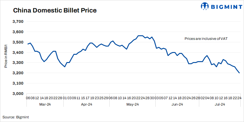 - Billet prices in Tangshan fell by RMB 30/t ($4/t) d-o-d to RMB 3,200/t ($440/t) on 24 Jul’24. Prices include 13% VAT.