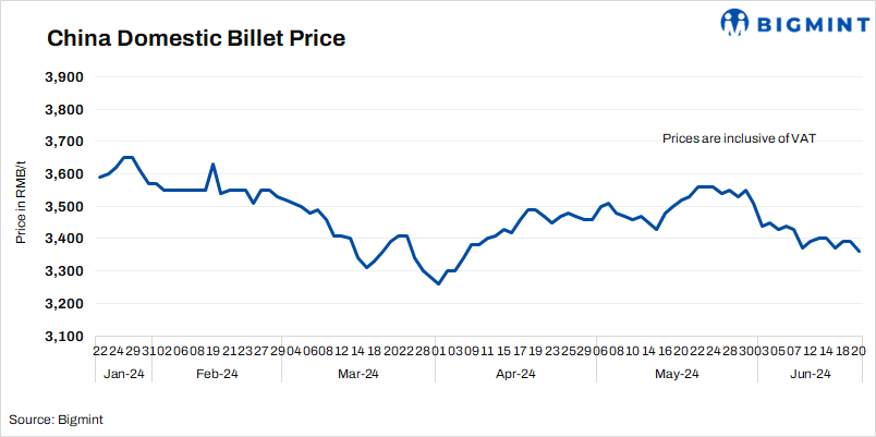 - Billet prices in Tangshan inched down d-o-d by RMB 30/t ($4/t) at RMB 3,360/t ($463/t) on 20 Jun’24. Prices include 13% VAT.