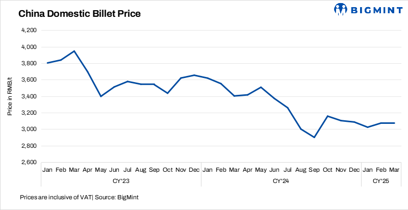 - Steel billet prices in China’s Tangshan fell by RMB 40/t ($5/t) d-o-d to 3,050/t ($419/t) on 4 Mar’25. Prices include 13% VAT.