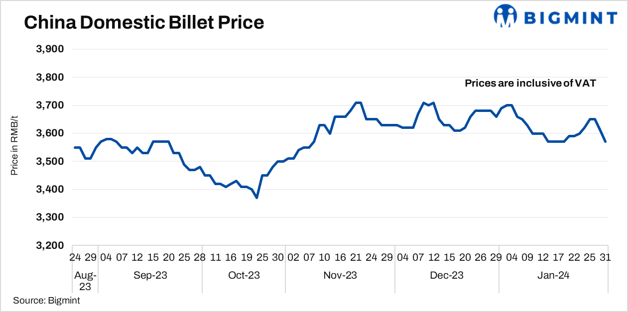 - Billet prices in Tangshan inched down by RMB 40/t ($6/t) d-o-d to stand at RMB 3,570/t ($503/t) on 31 Jan’24. Prices include 13% VAT.