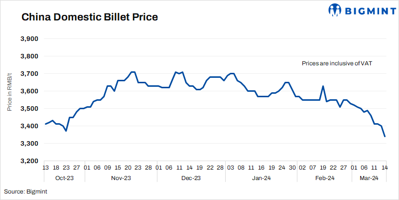 - Billet prices in Tangshan fell sharply by RMB 60/t ($8/t) d-o-d to RMB 3,340/t ($465/t) on 14 Mar’24. Prices include 13% VAT.