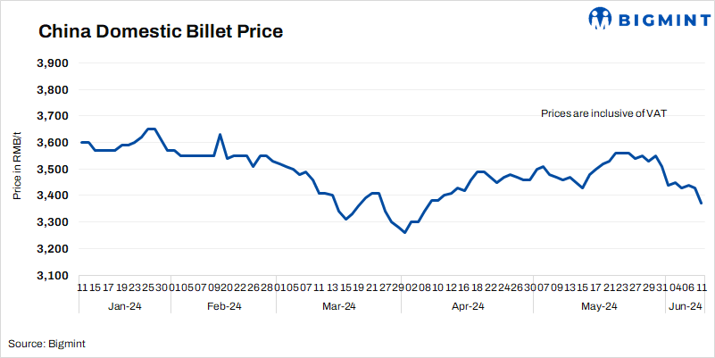- Billet prices in Tangshan fell by RMB 60/t ($8/t) to RMB 3,370/t ($465/t) on 11 Jun’24 against 7 Jun’24. Prices include 13% VAT.