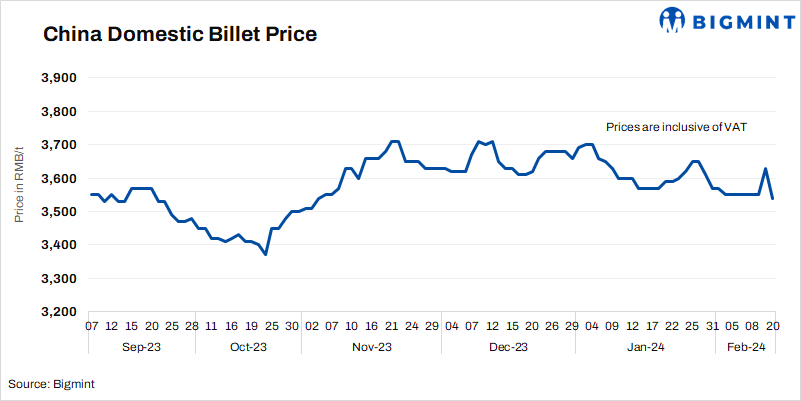 - Billet prices in Tangshan fell sharply d-o-d by RMB 90/t ($13/t) to RMB 3,540/t ($492/t) on 20 Feb’24. Prices include 13% VAT.