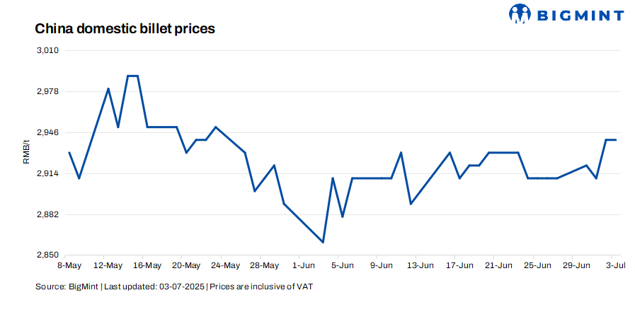- Steel billet prices in Tangshan, China, stood firm d-o-d at RMB 2,940/t ($410/t), including 13% VAT, on 3 Jul’25.