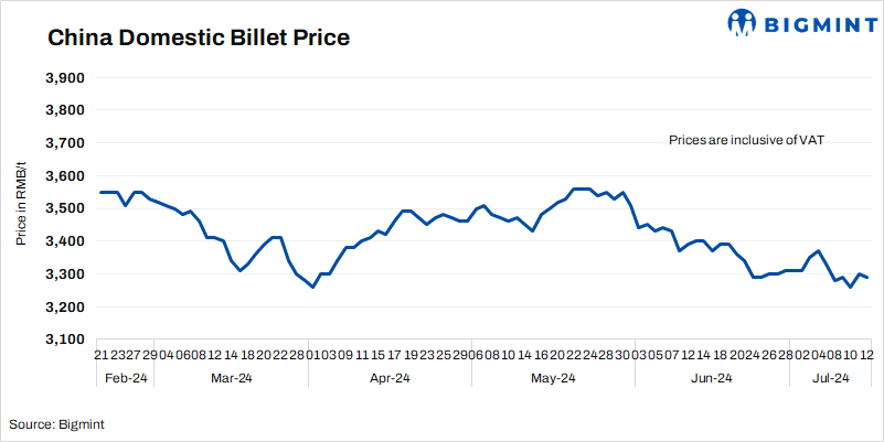 - Billet prices in Tangshan fell by RMB 10/t ($1/t) d-o-d to RMB 3,290/t ($454/t) on 12 Jul’24. Prices include 13% VAT.