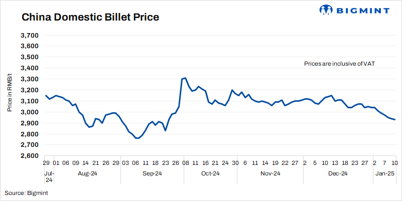 • Steel billet prices in China’s Tangshan edged down by RMB 10/t ($1/t) d-o-d to RMB 2,930/t ($400/t) on 10 Jan’25. Prices include 13% VAT.