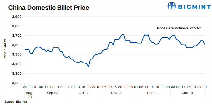 • Billet prices in Tangshan inched down by RMB 40/t ($6/t) d-o-d to RMB 3,610/t ($508/t) on 30 Jan’24 against 29 Jan. Prices include 13% VAT.