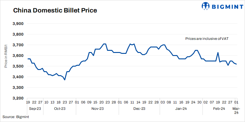 • Billet prices in Tangshan fell by RMB 10/t ($1/t) to RMB 3,520/t ($489/t) on 1 Mar’24. Prices include 13% VAT.