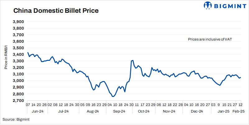 • Steel billet prices in China’s Tangshan edged up by RMB 10/t ($1/t) d-o-d to RMB 3,050/t ($417/t) on 12 Feb’25. Prices include 13% VAT.