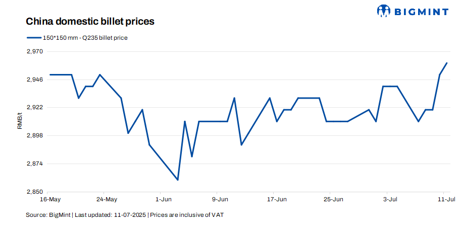 • Steel billet prices in Tangshan, China, inched up by RMB 10/t ($1/t) d-o-d to RMB 2,960/t ($413/t), including 13% VAT, on 11 Jul’25.