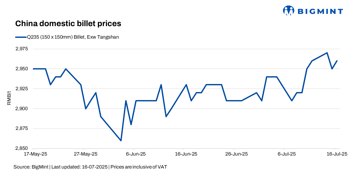 - Steel billet prices in Tangshan, China, inched up by RMB 10/t ($1/t) d-o-d to RMB 2,960/t ($412/t), including 13% VAT, on 16 Jul’25.