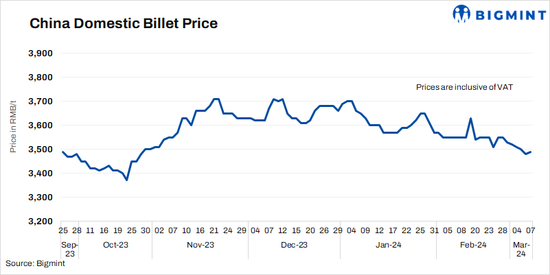 - Billet prices in Tangshan edged up by RMB 10/t ($1/t) d-o-d to RMB 3,490/t ($485/t) on 7 Mar’24. Prices include 13% VAT.