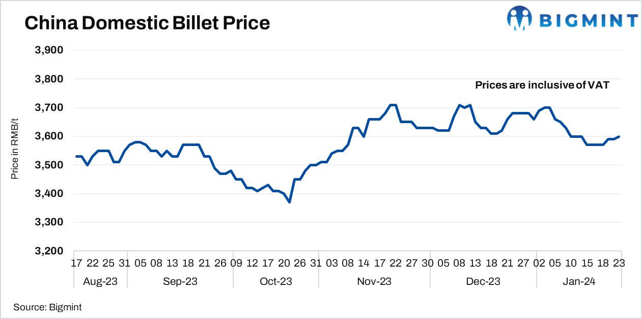 - Billet prices in Tangshan inched up by RMB 10/t ($1/t) d-o-d to RMB 3,600/t ($507/t) on 23 Jan’24. Prices include 13% VAT.