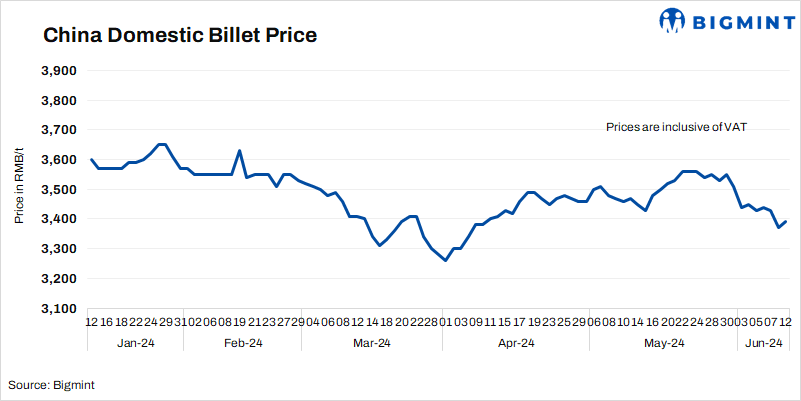 - Billet prices in Tangshan edged up d-o-d by RMB 20/t ($3/t) to RMB 3,390/t ($468/t) on 12 Jun’24. Prices include 13% VAT.